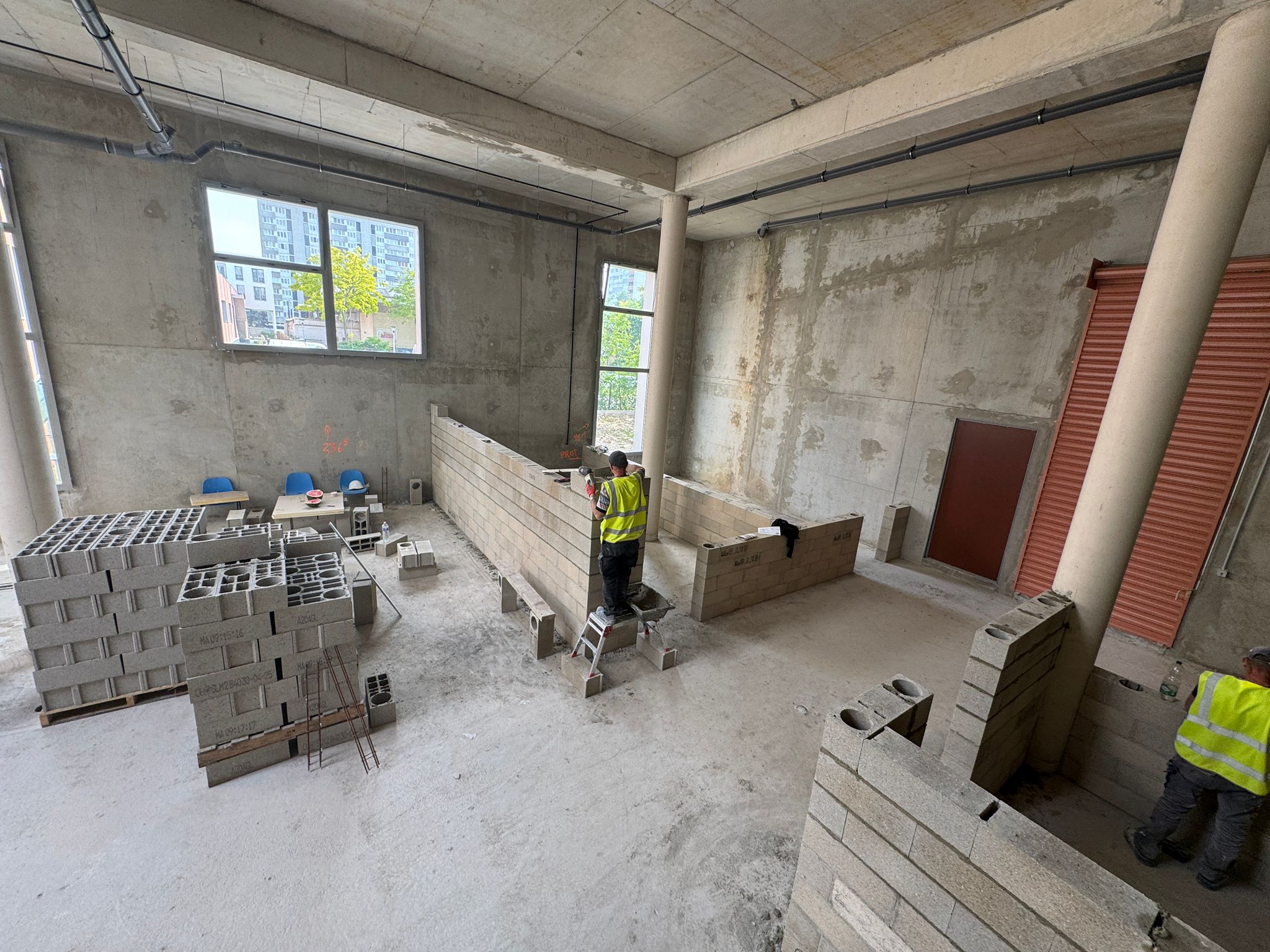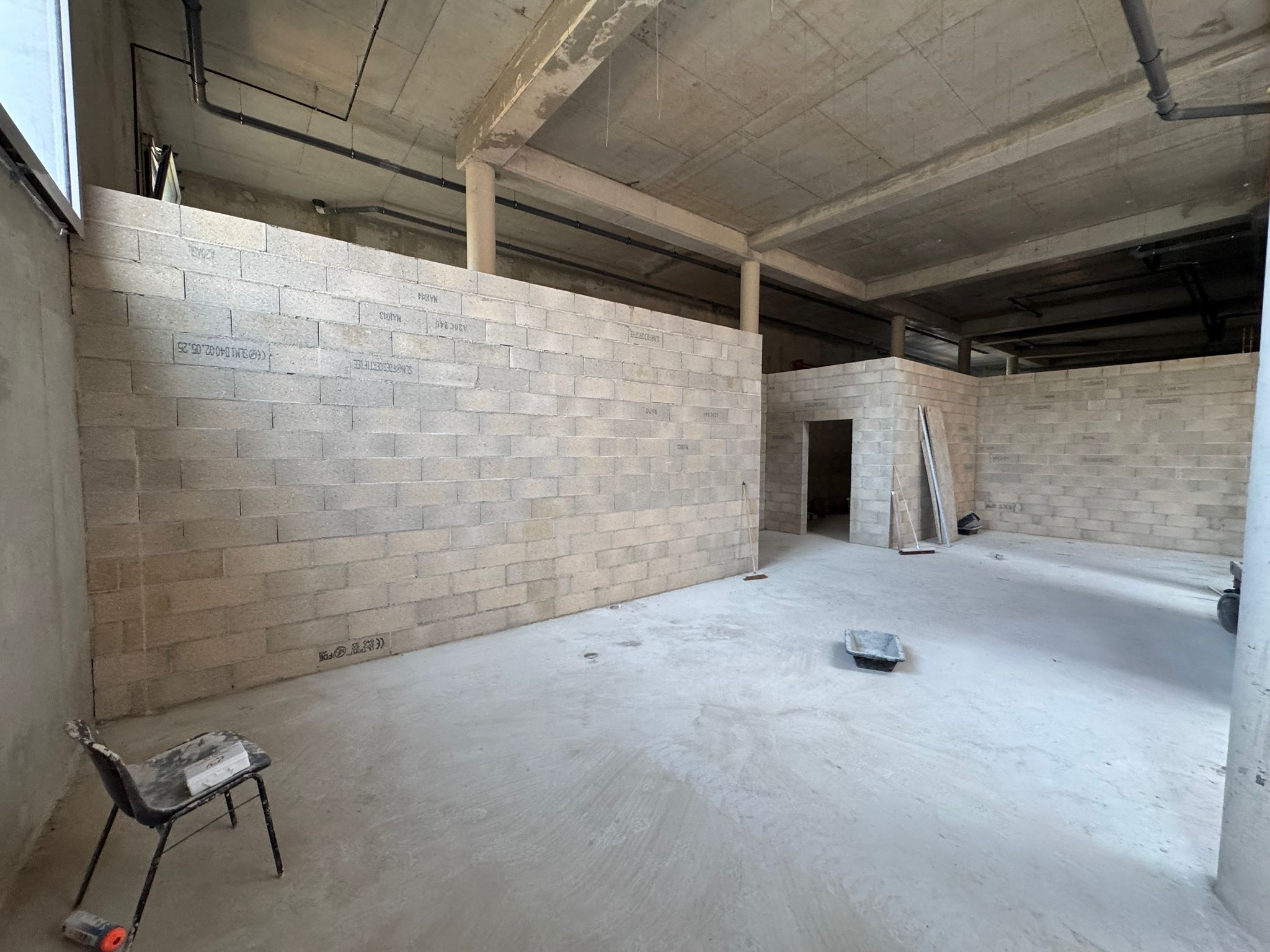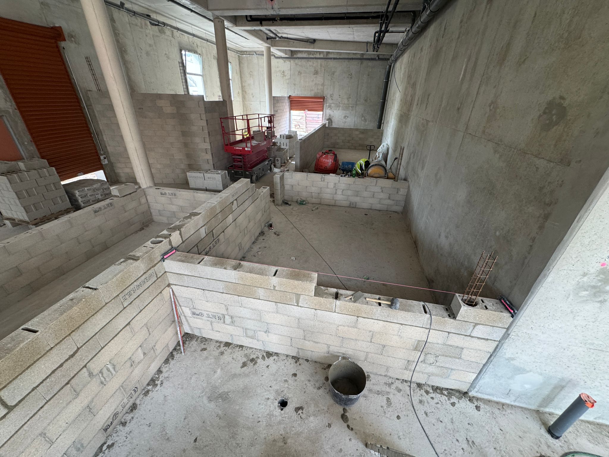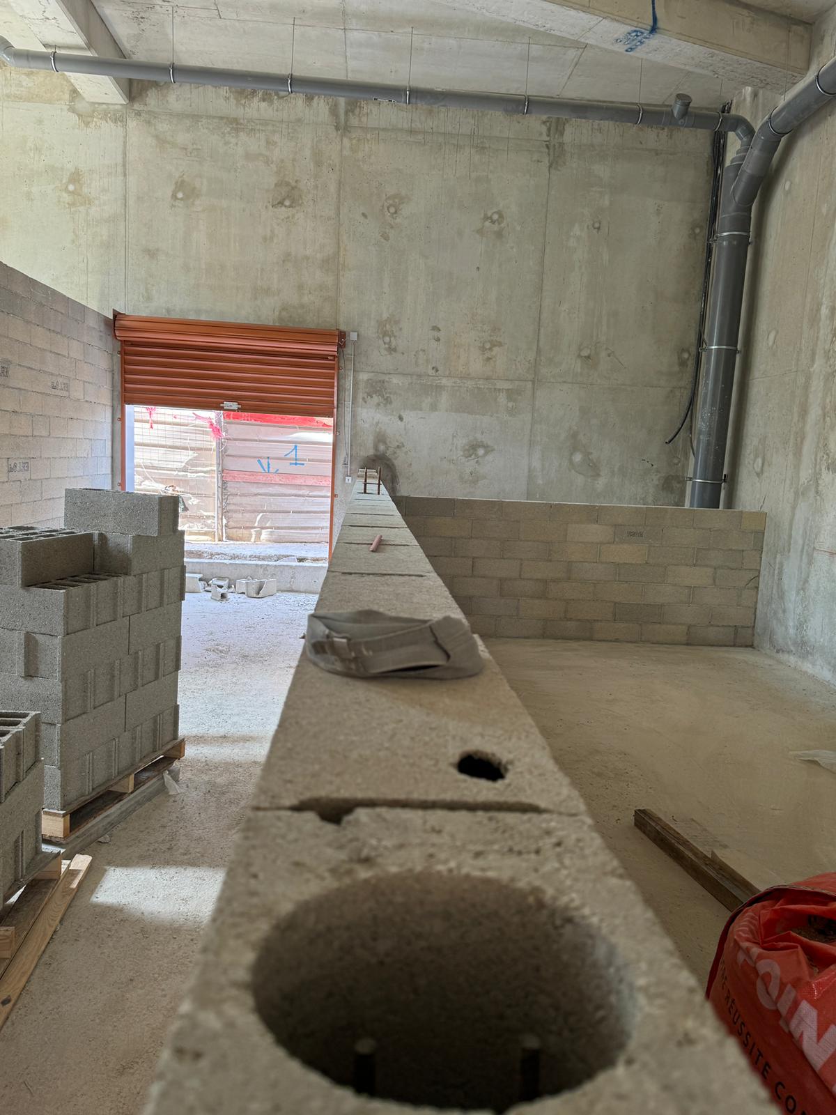 Dans ce chantier situé à Clichy, les équipes ont réalisé les séparations intérieures en blocs béton, avec création des cloisons, réservations verticales, attentes structurelles et préparation des passages techniques. Cette phase est essentielle dans un bâtiment commercial, car elle conditionne à la fois la circulation, la répartition des surfaces et l’implantation future des zones d’exploitation, de stockage ou d’accueil.