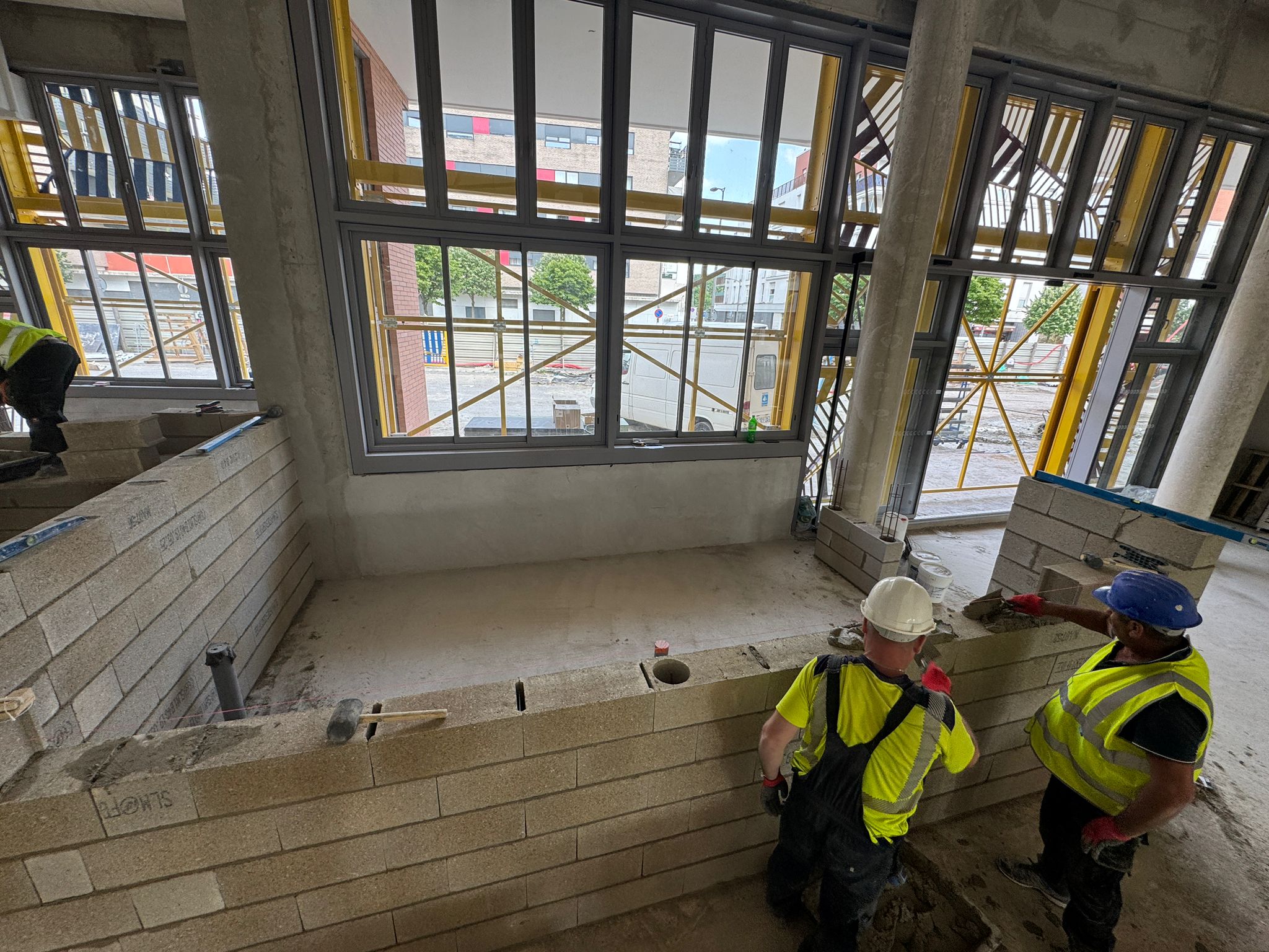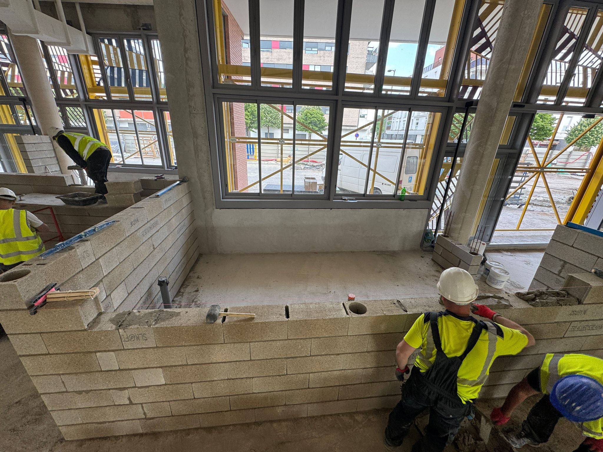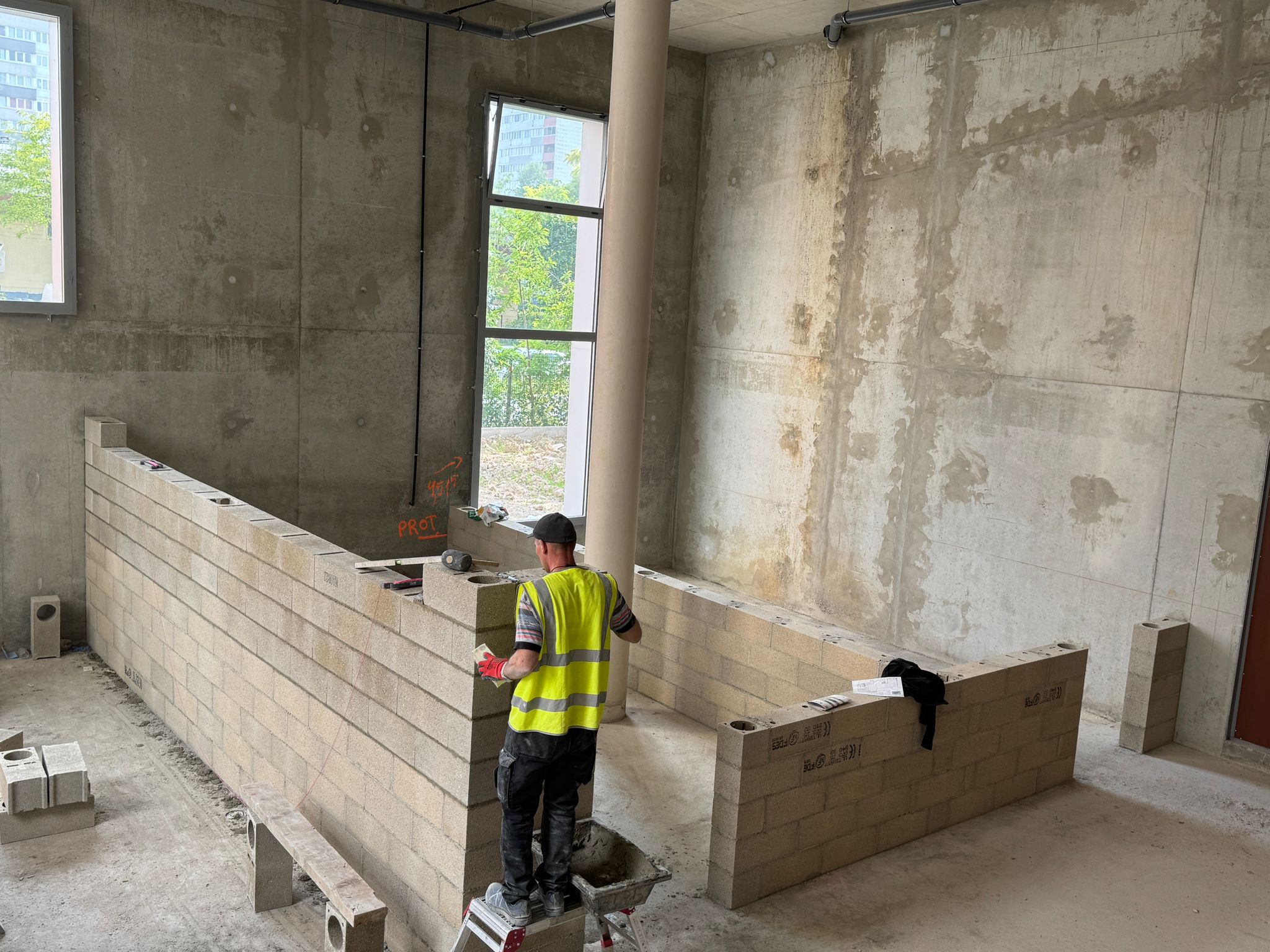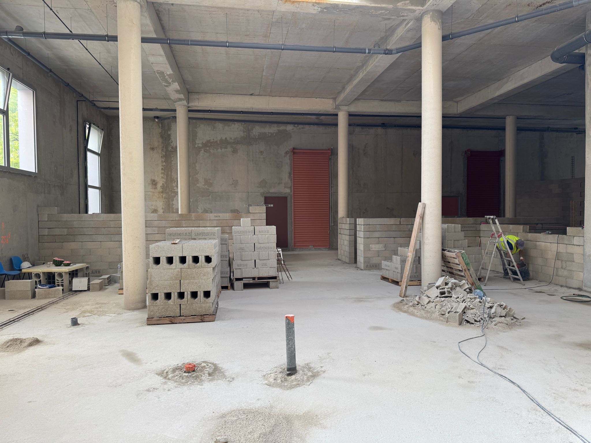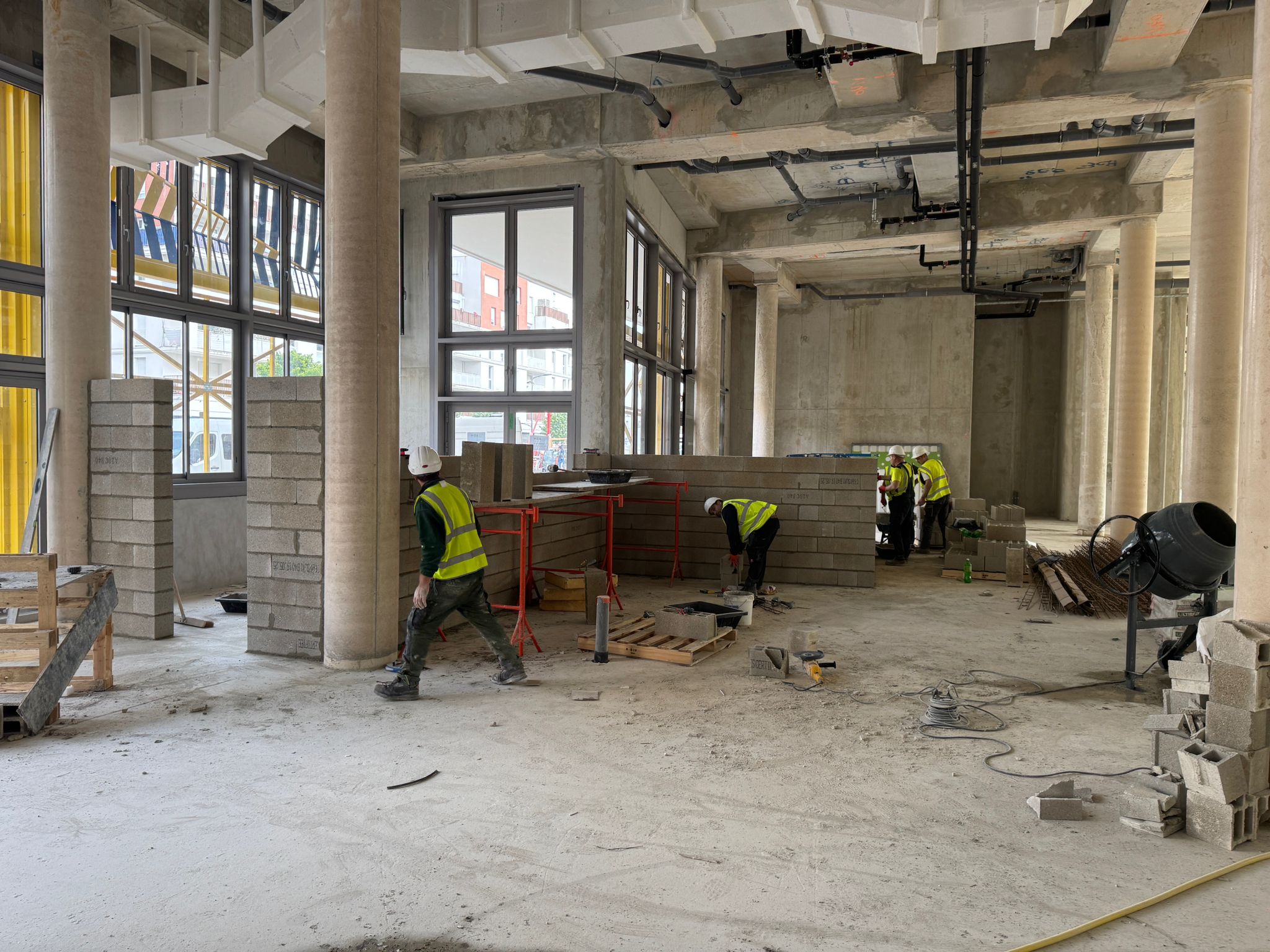 Dans ce chantier situé à Clichy, les équipes ont réalisé les séparations intérieures en blocs béton, avec création des cloisons, réservations verticales, attentes structurelles et préparation des passages techniques. Cette phase est essentielle dans un bâtiment commercial, car elle conditionne à la fois la circulation, la répartition des surfaces et l’implantation future des zones d’exploitation, de stockage ou d’accueil.