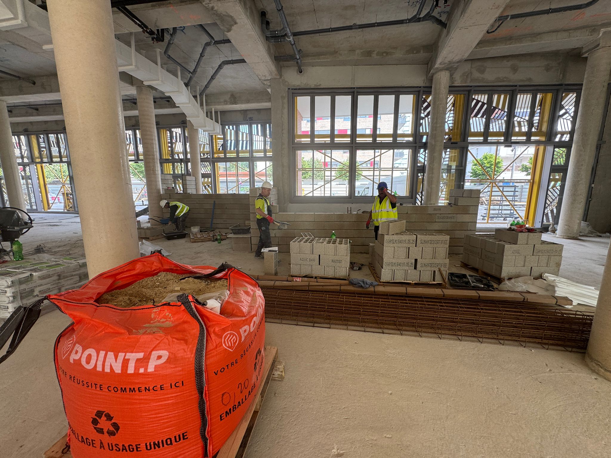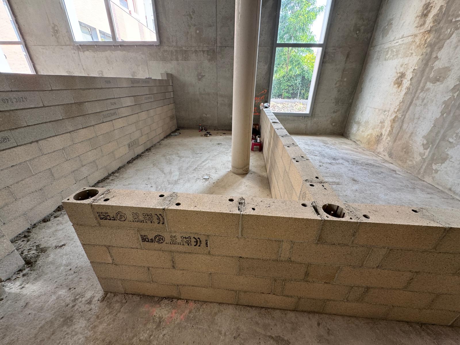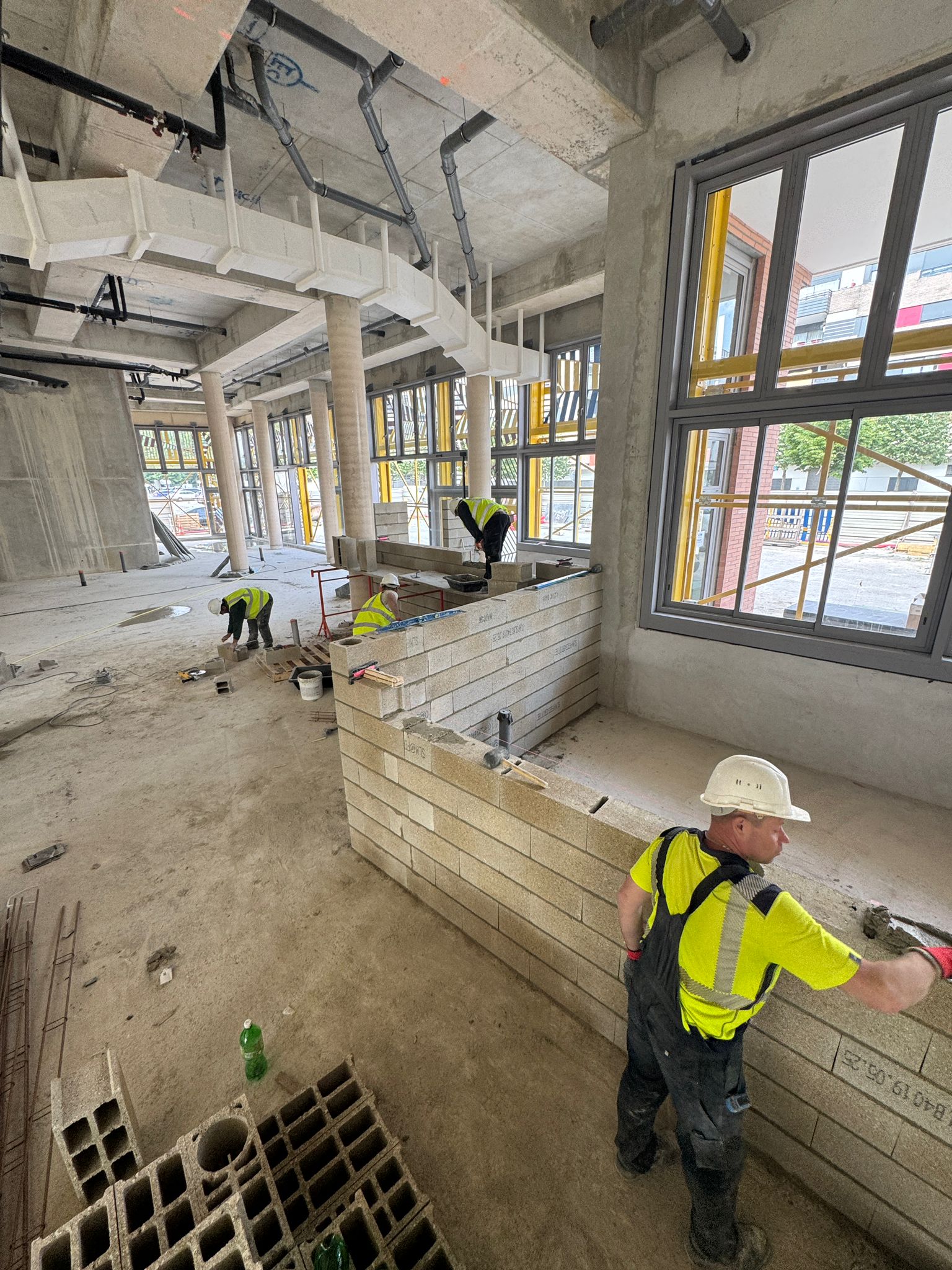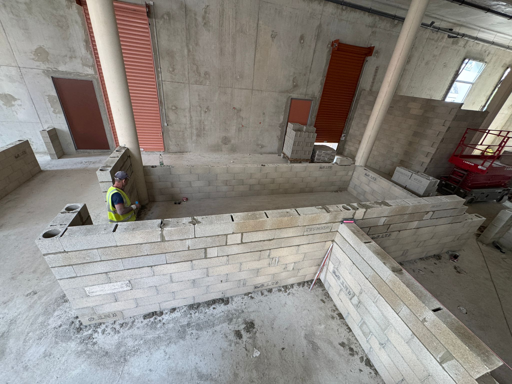 Dans ce chantier situé à Clichy, les équipes ont réalisé les séparations intérieures en blocs béton, avec création des cloisons, réservations verticales, attentes structurelles et préparation des passages techniques. Cette phase est essentielle dans un bâtiment commercial, car elle conditionne à la fois la circulation, la répartition des surfaces et l’implantation future des zones d’exploitation, de stockage ou d’accueil.