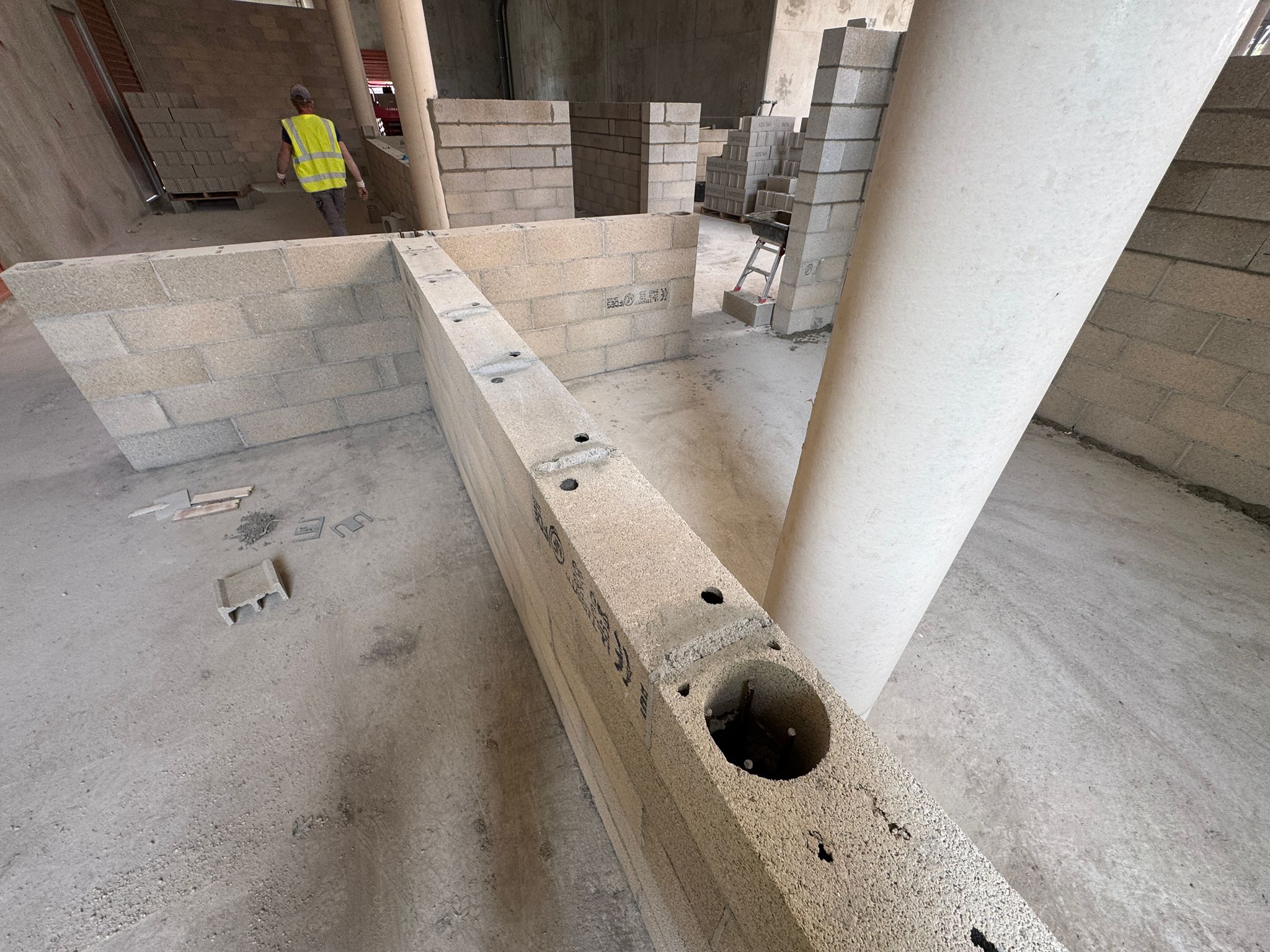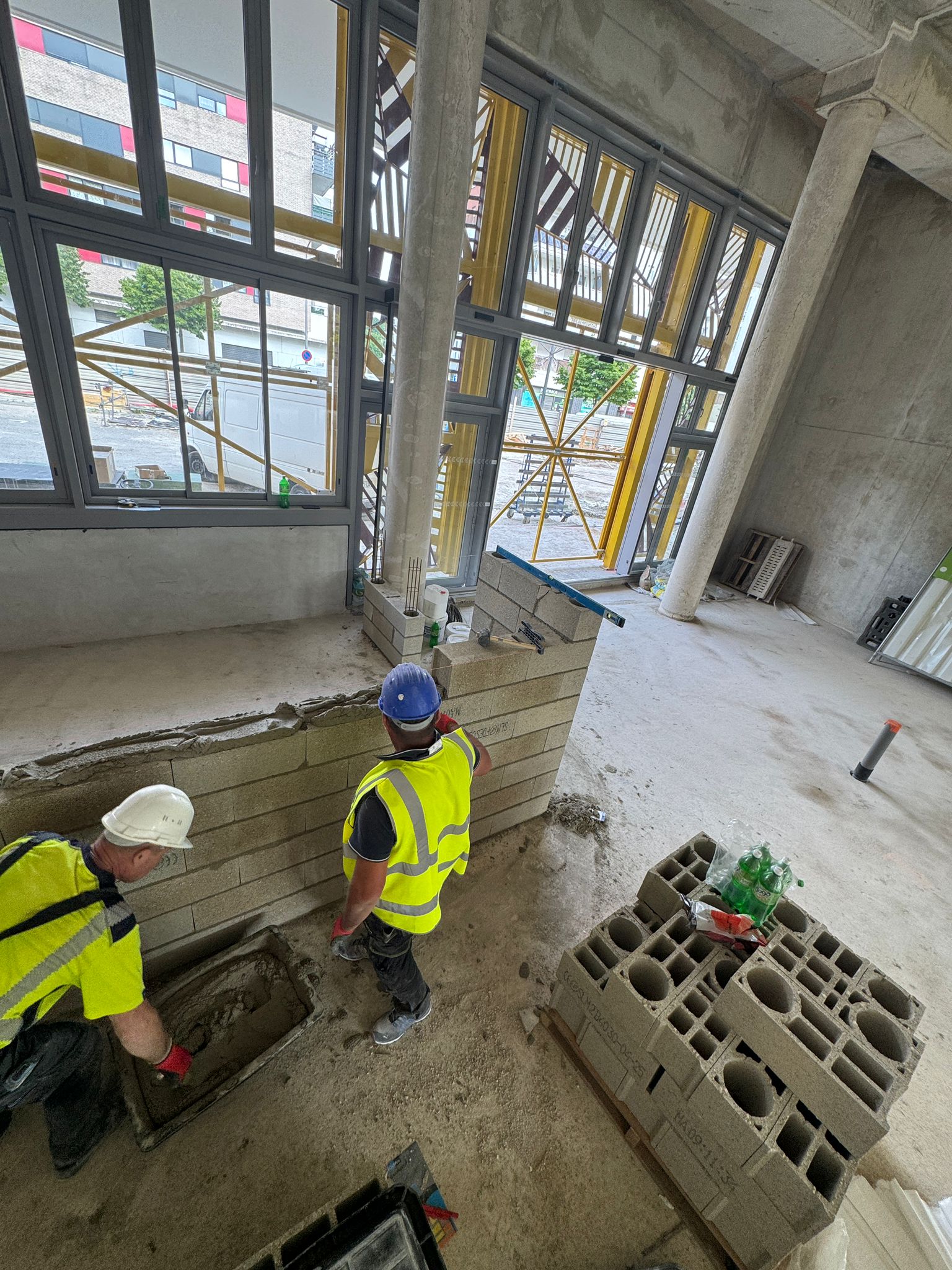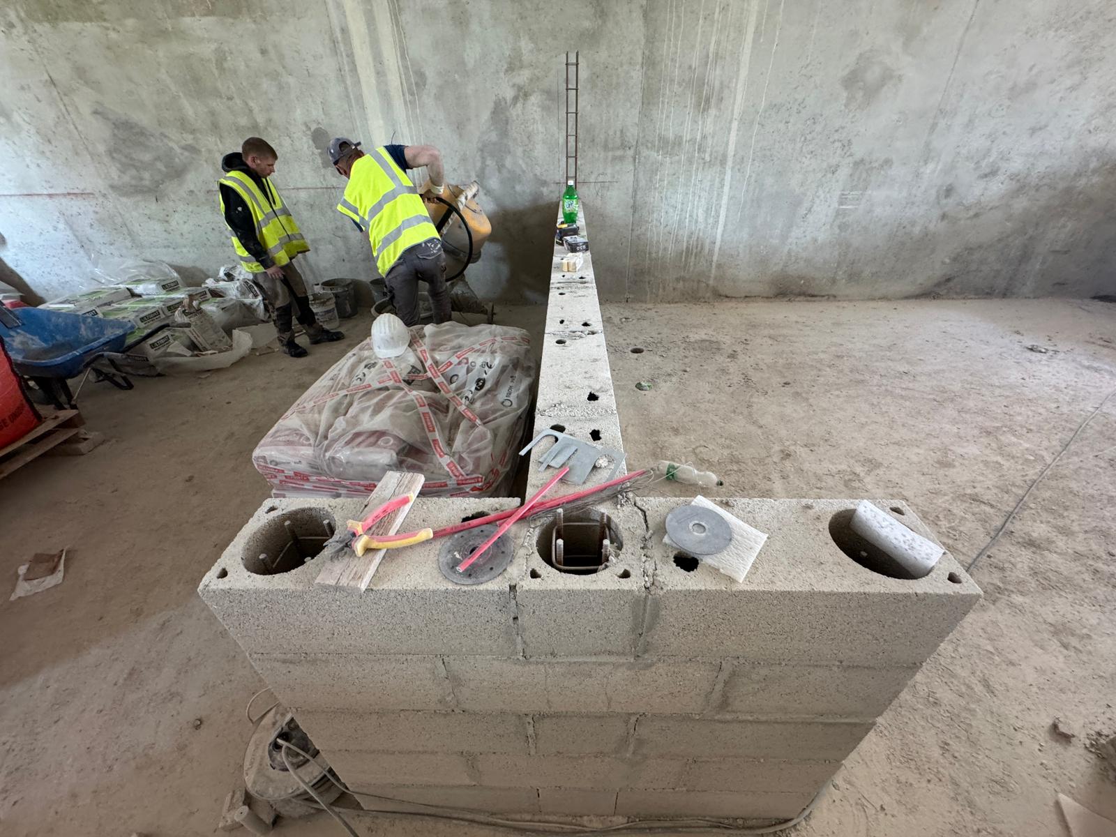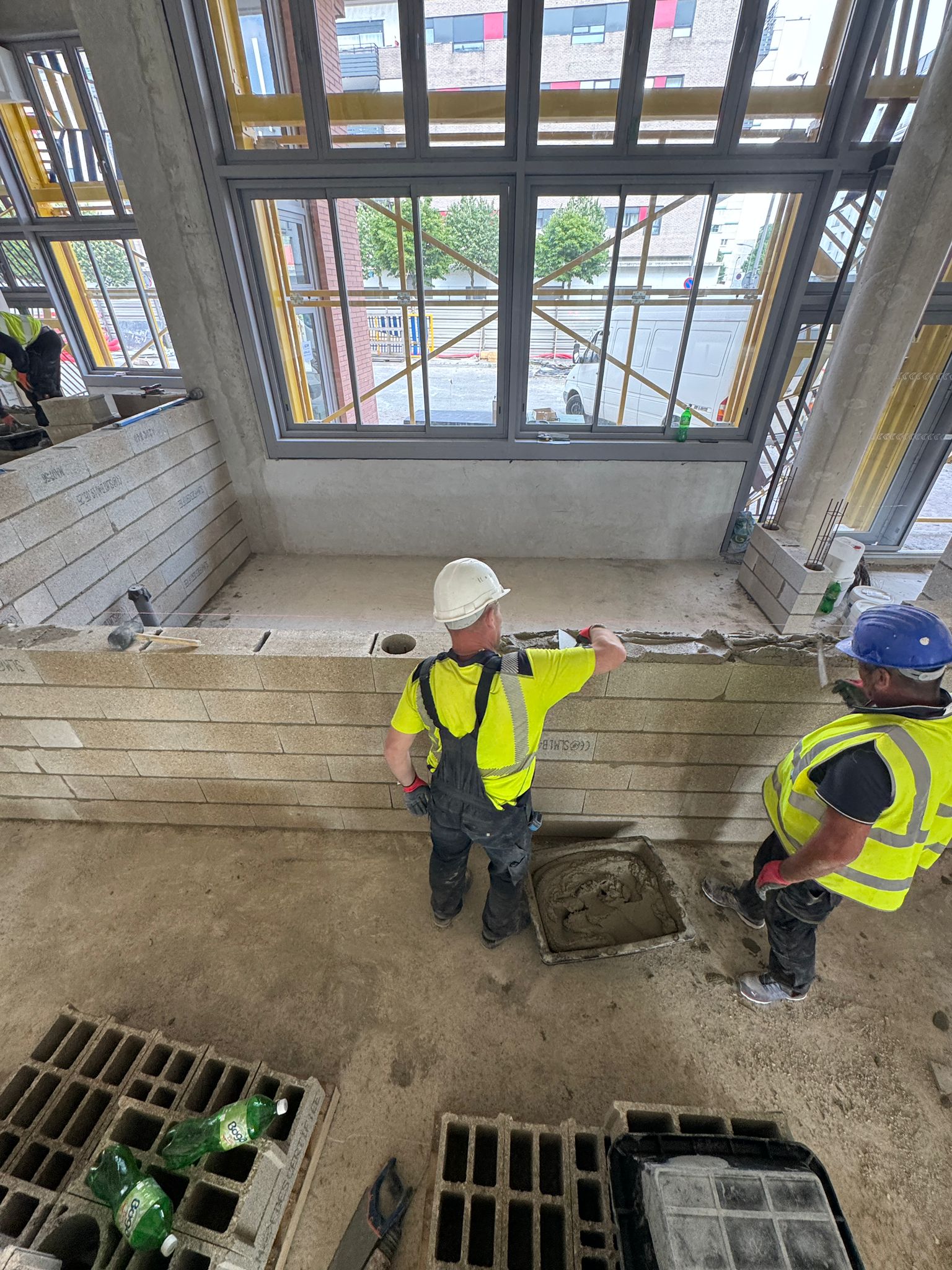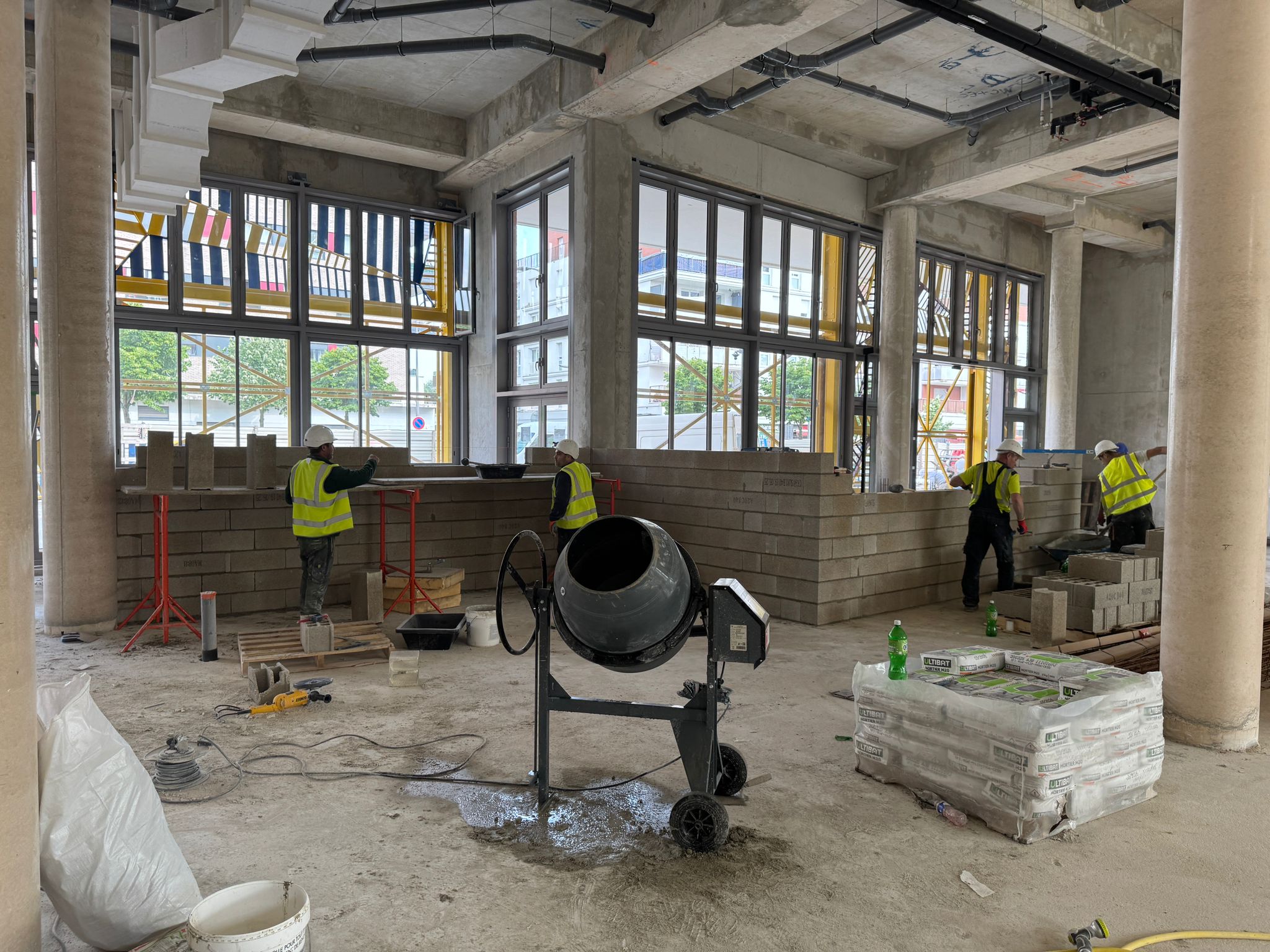 Dans ce chantier situé à Clichy, les équipes ont réalisé les séparations intérieures en blocs béton, avec création des cloisons, réservations verticales, attentes structurelles et préparation des passages techniques. Cette phase est essentielle dans un bâtiment commercial, car elle conditionne à la fois la circulation, la répartition des surfaces et l’implantation future des zones d’exploitation, de stockage ou d’accueil.