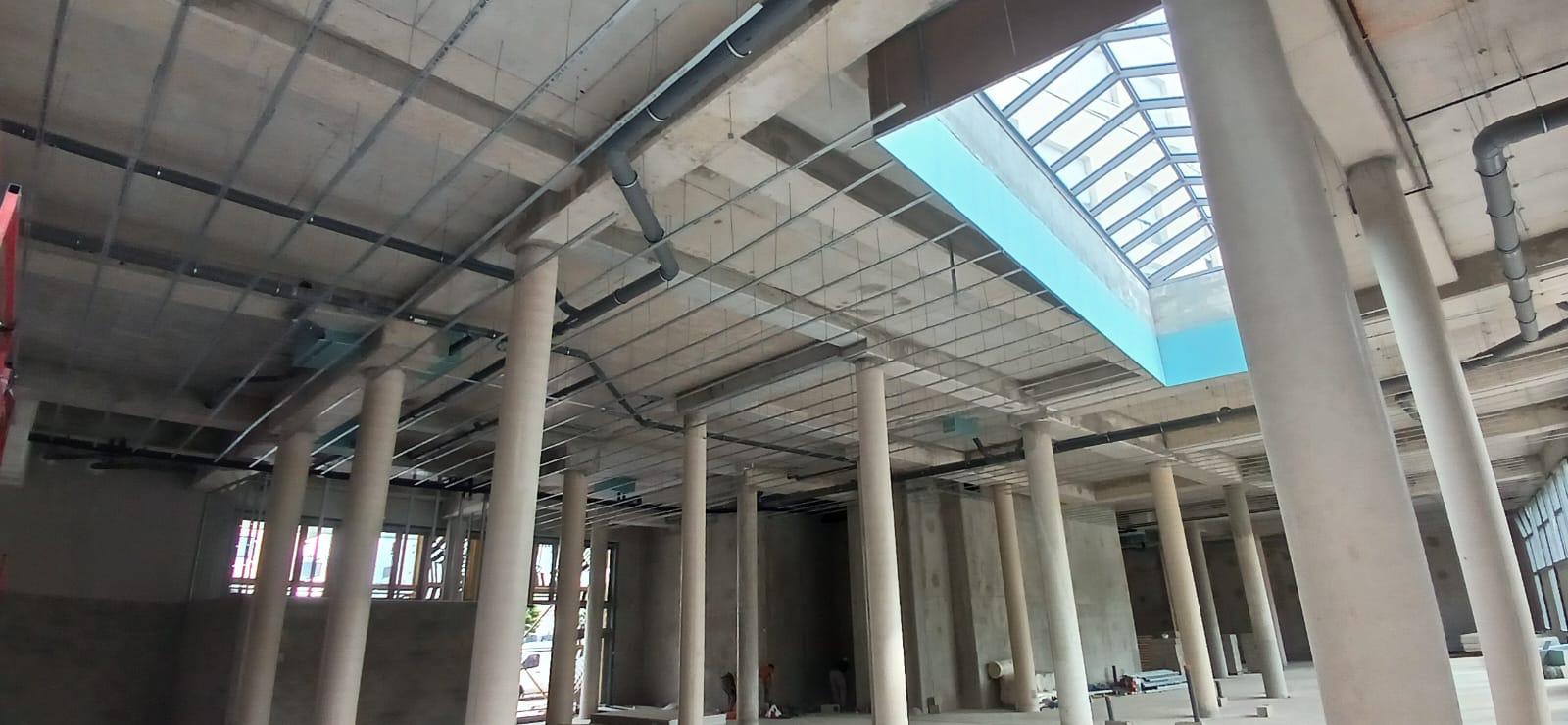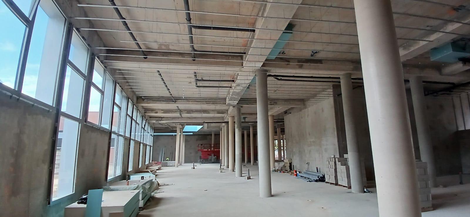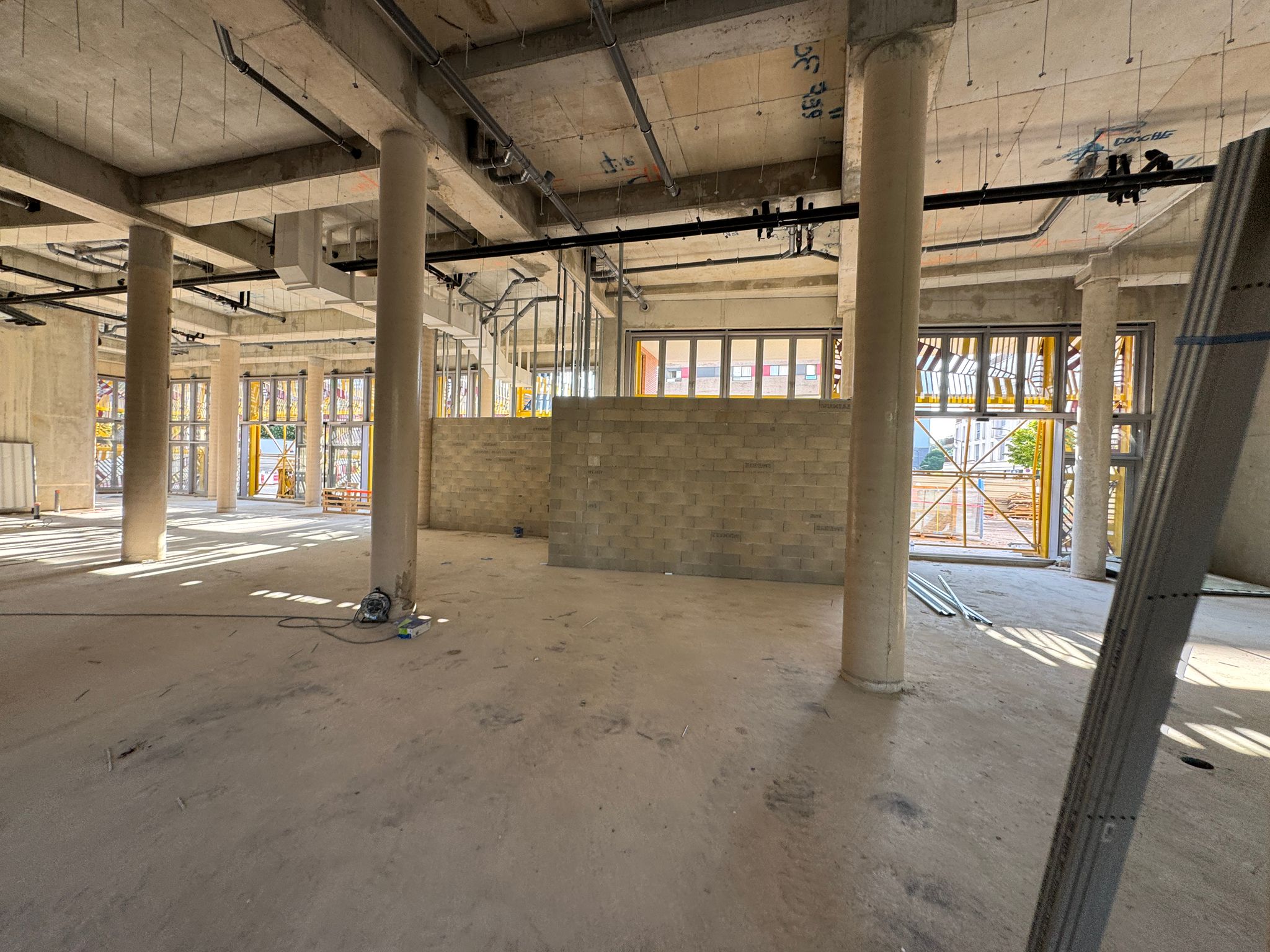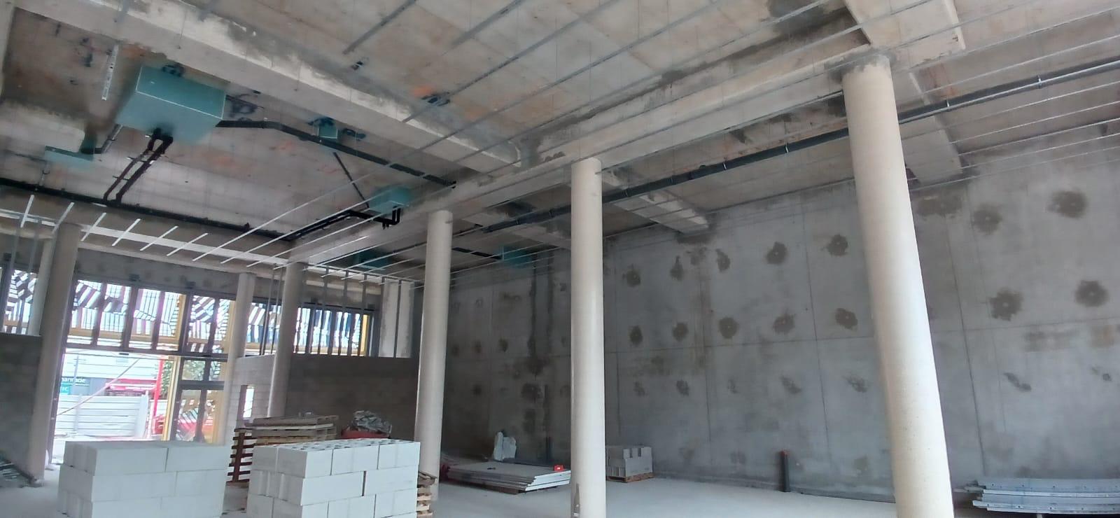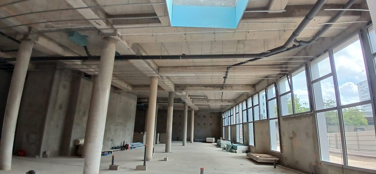 La construction de ce bâtiment commercial à Clichy comprend la mise en place de volumes distincts, la constitution des murs de distribution et l’organisation de plusieurs espaces dans une enveloppe brute en béton. On observe également la présence de fermetures techniques, de réseaux en plafond et d’un phasage de chantier adapté à un environnement professionnel en cours d’aménagement.