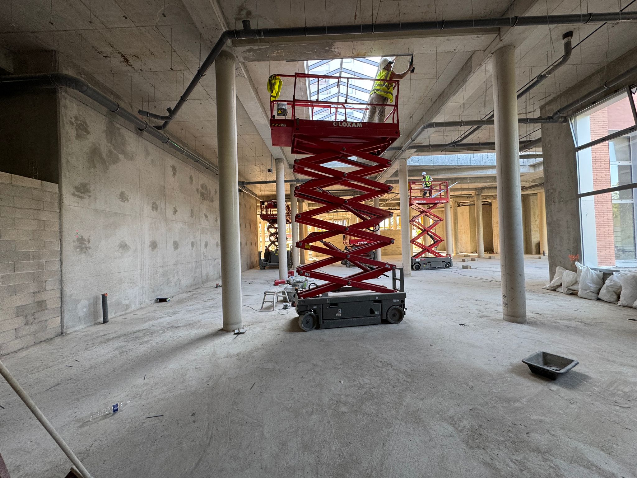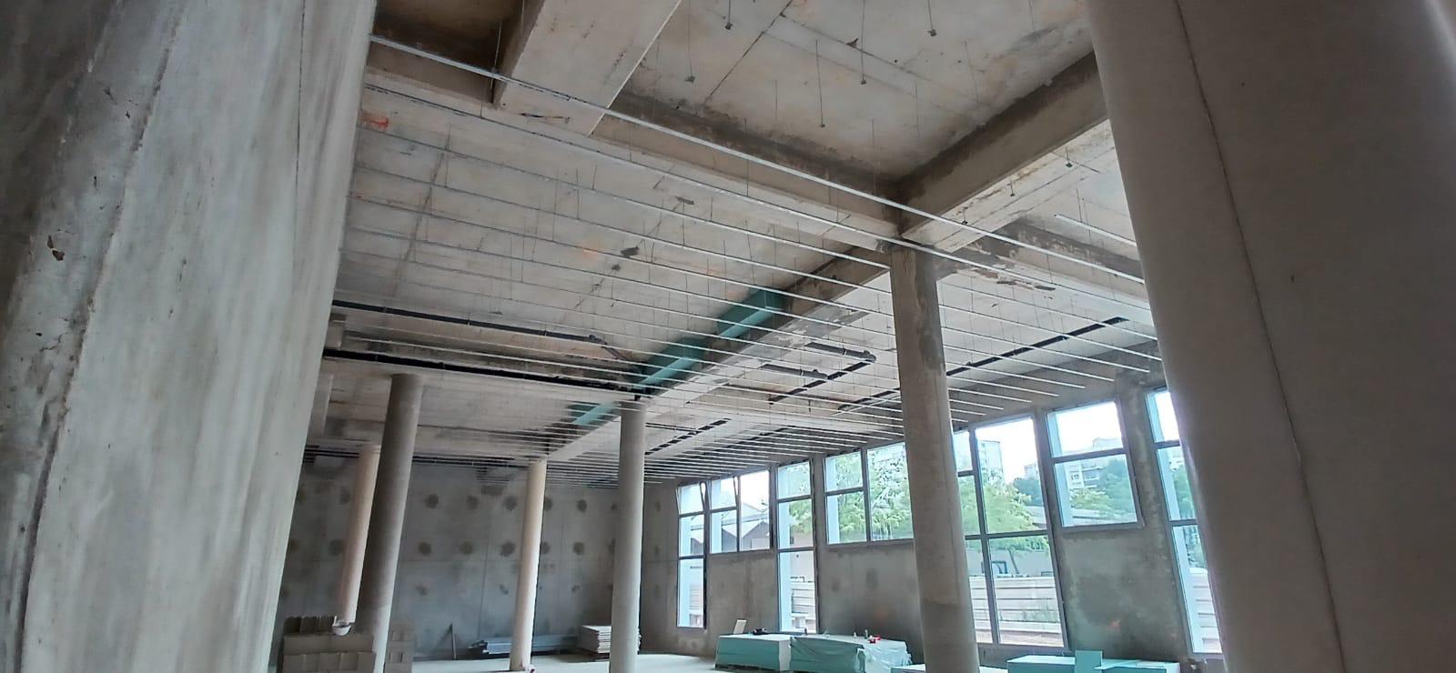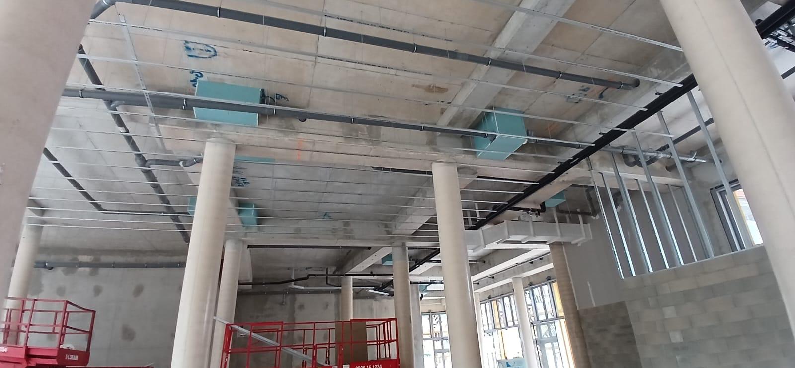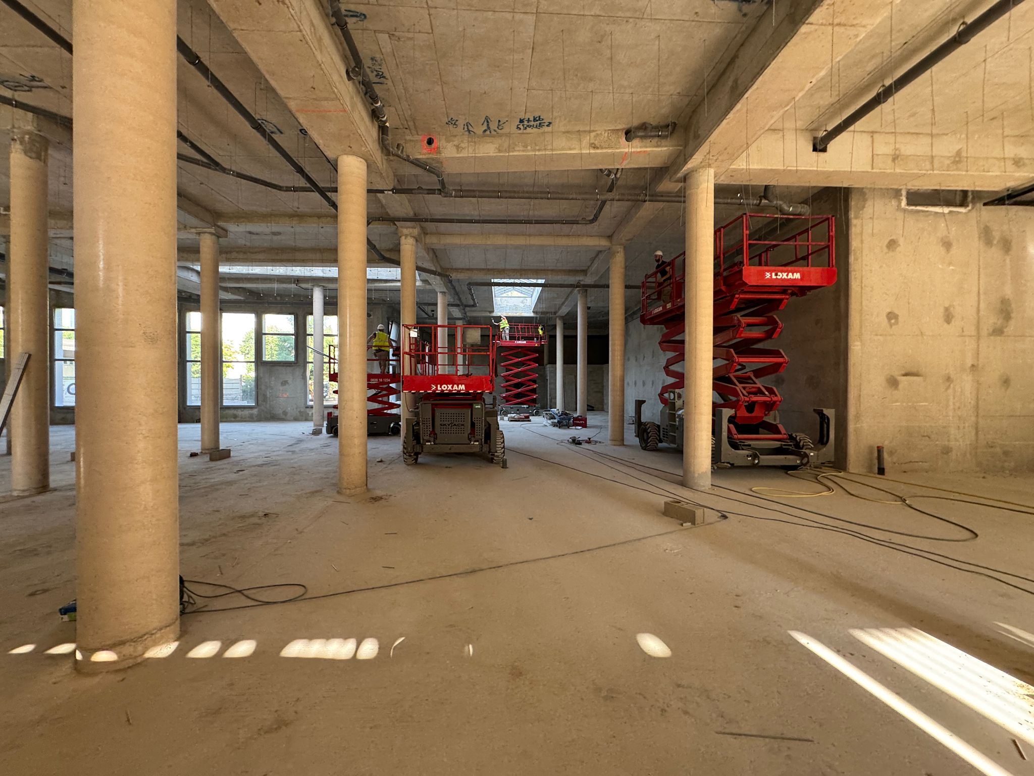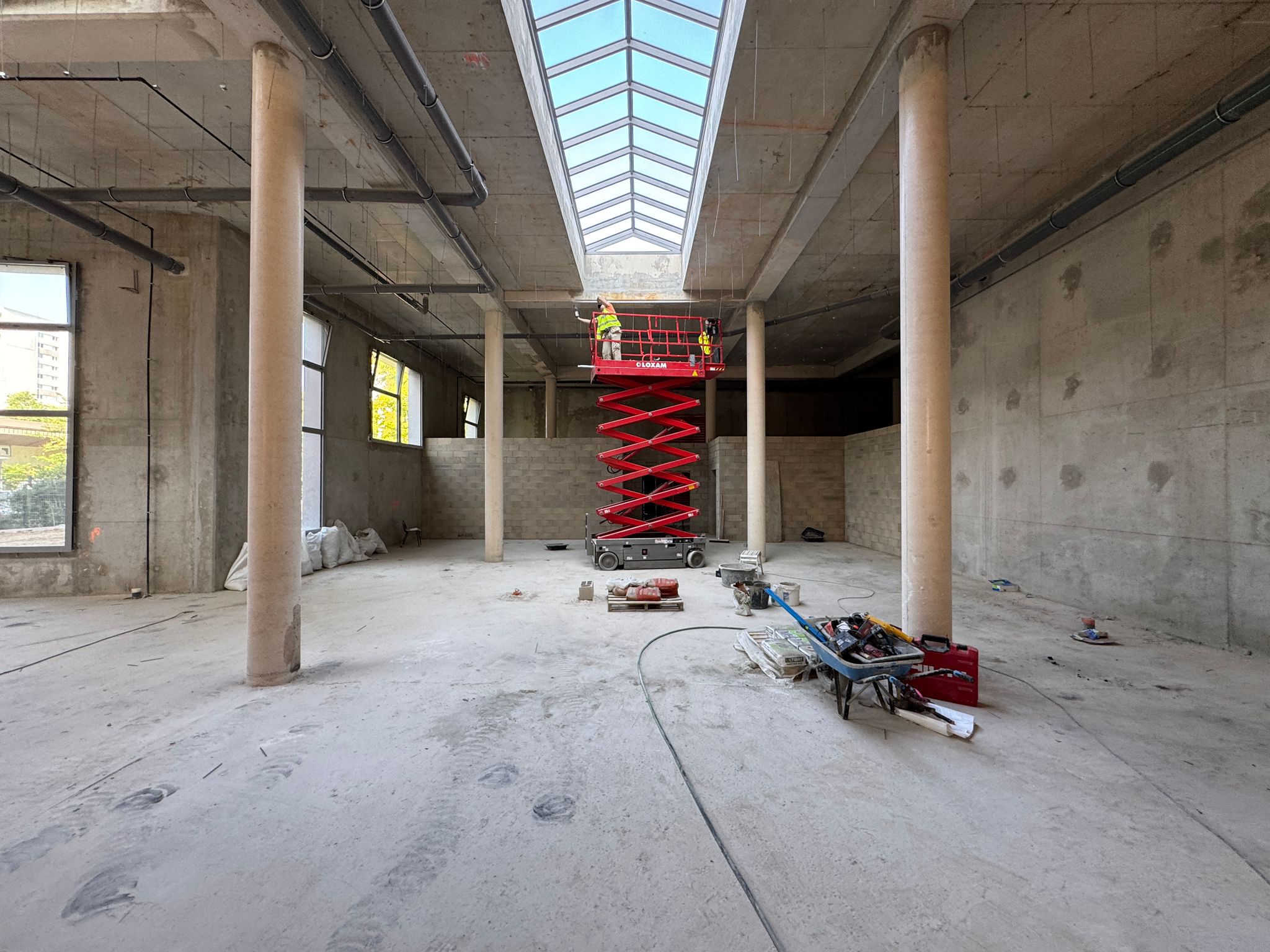 La construction de ce bâtiment commercial à Clichy comprend la mise en place de volumes distincts, la constitution des murs de distribution et l’organisation de plusieurs espaces dans une enveloppe brute en béton. On observe également la présence de fermetures techniques, de réseaux en plafond et d’un phasage de chantier adapté à un environnement professionnel en cours d’aménagement.
