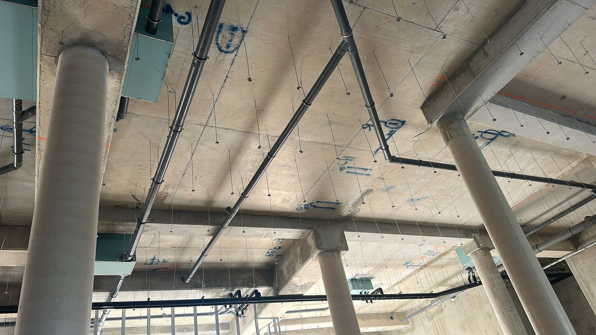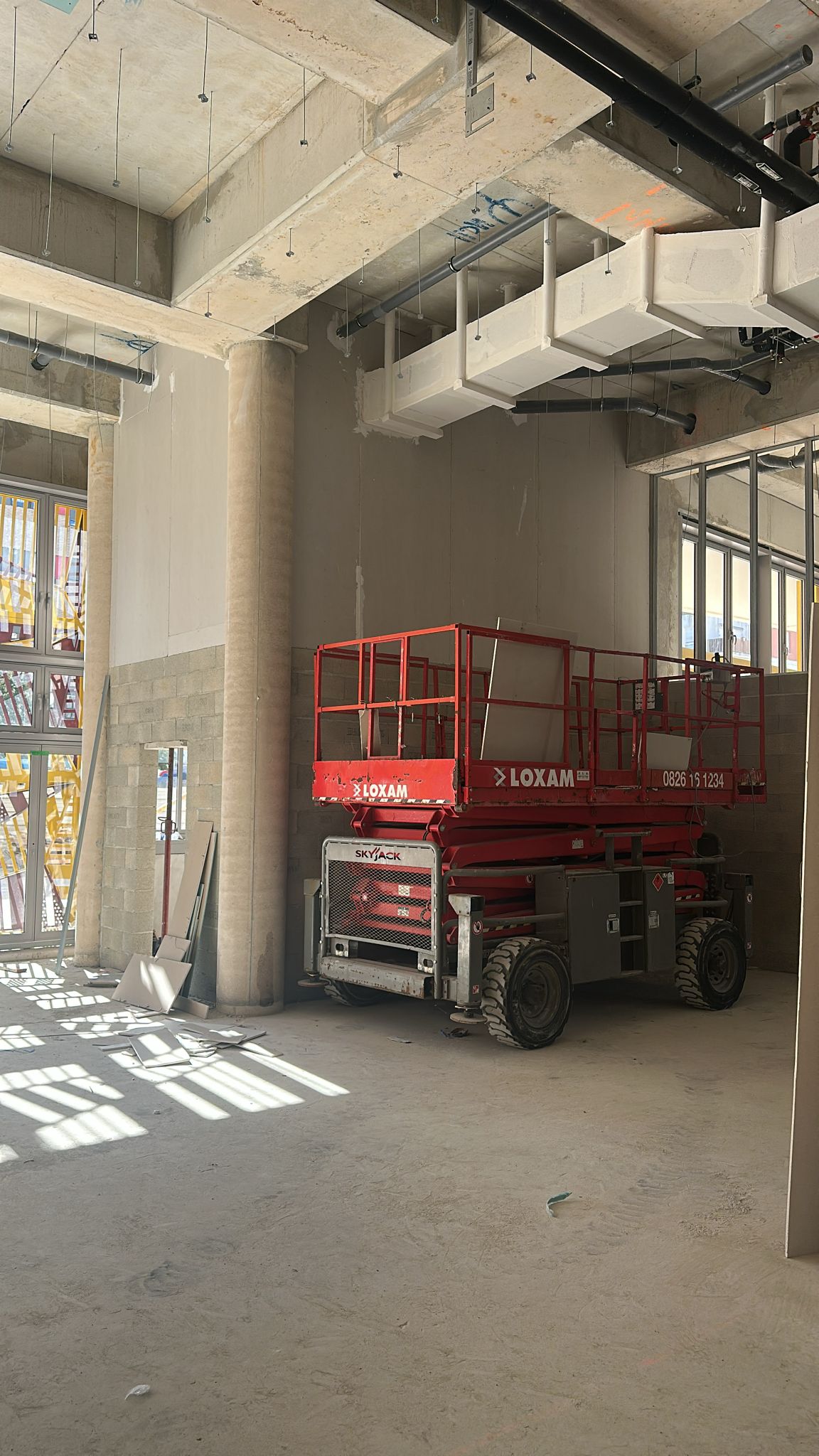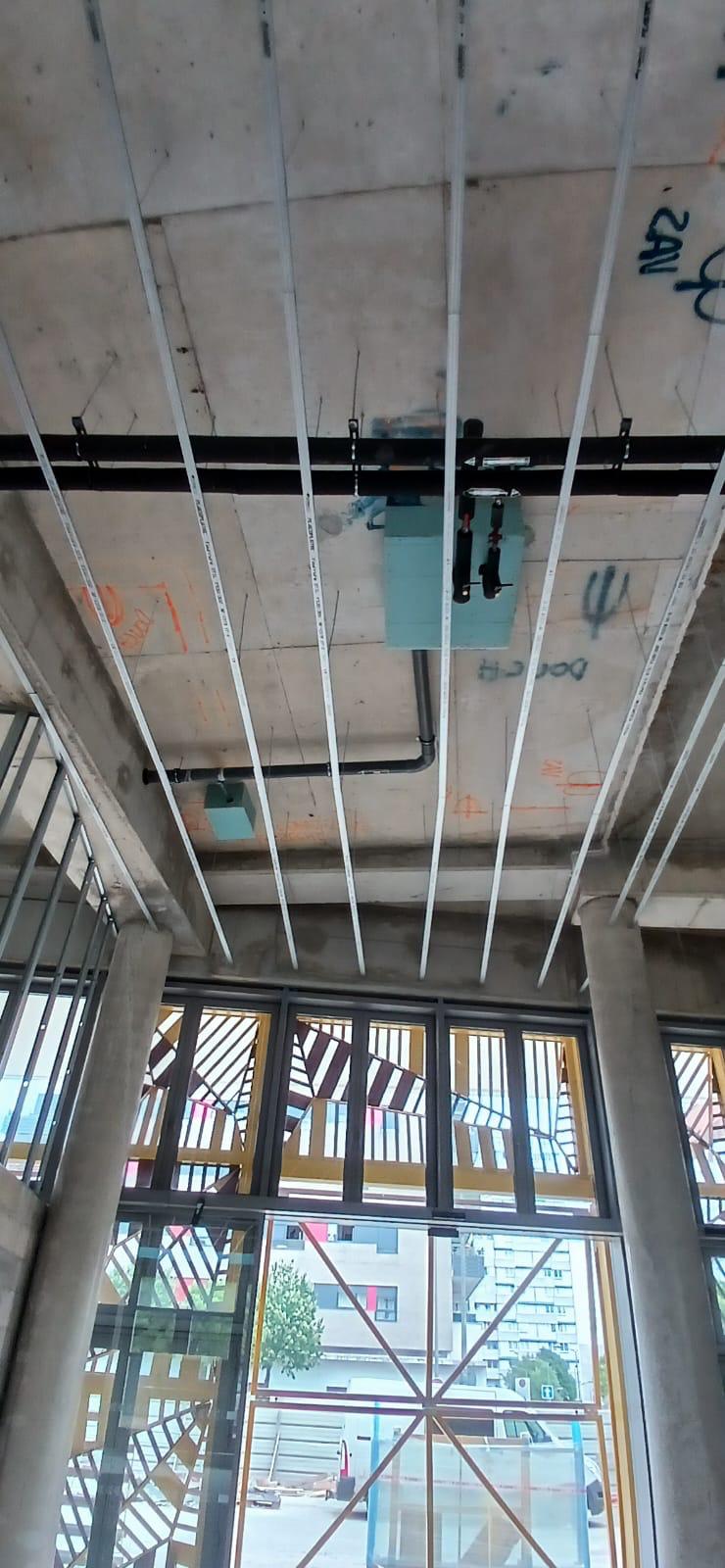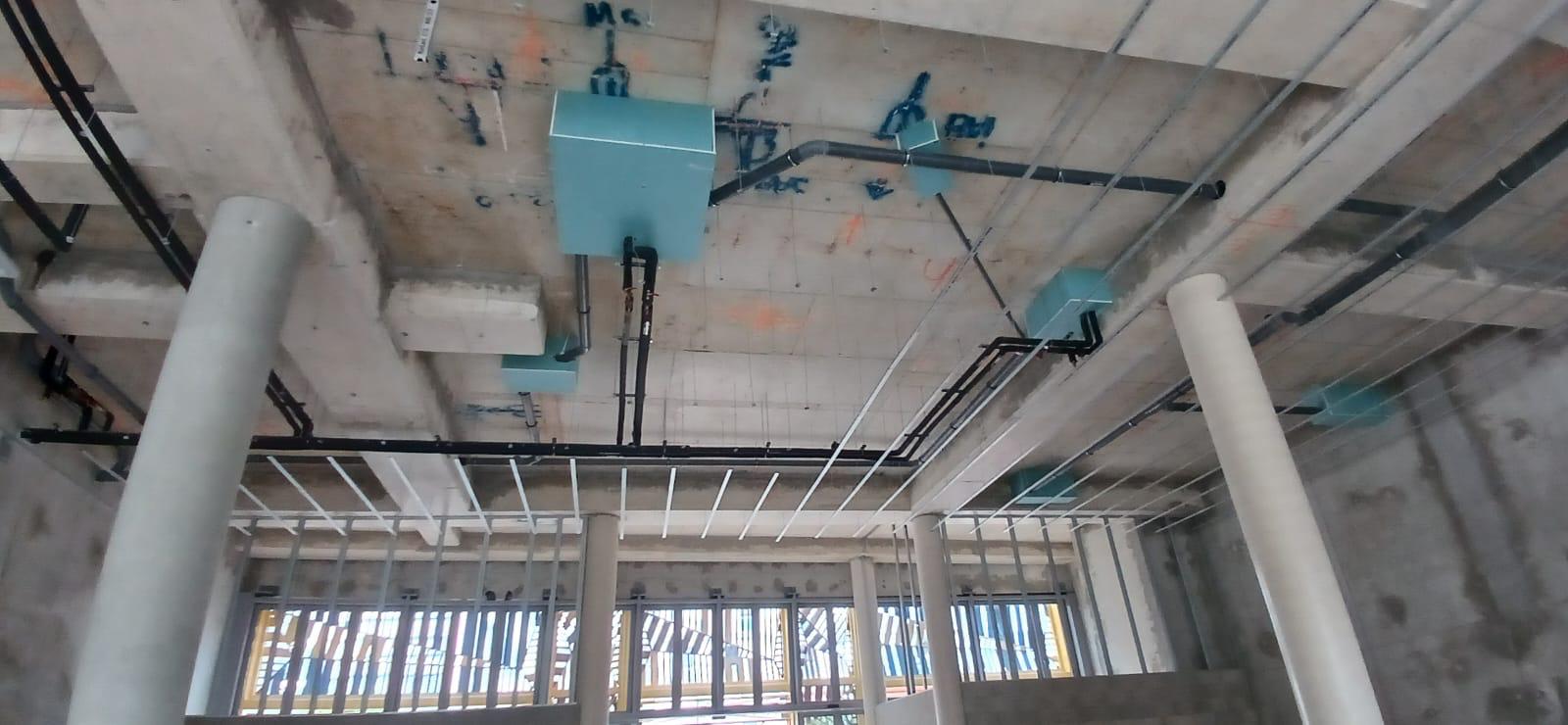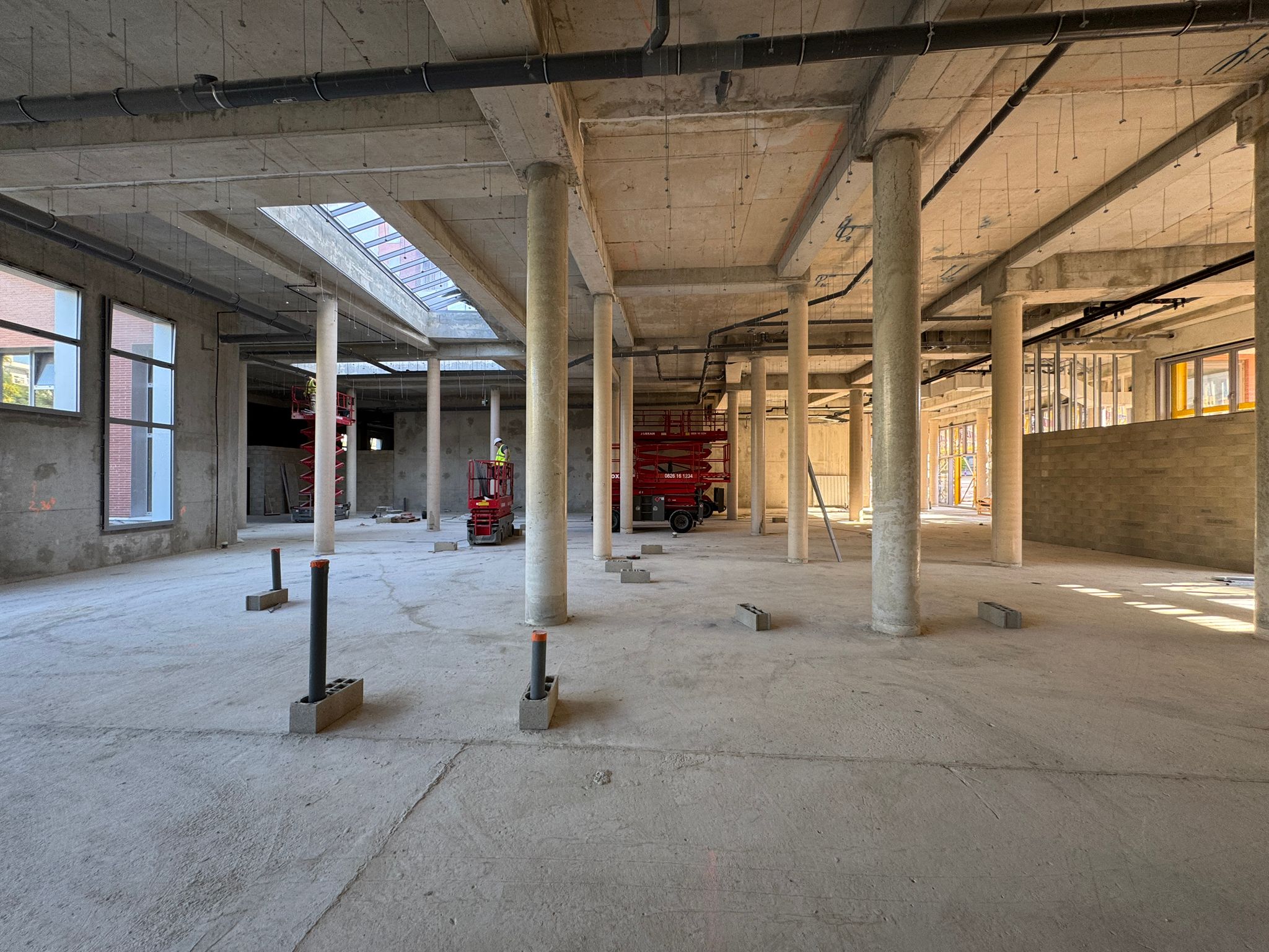 La construction de ce bâtiment commercial à Clichy comprend la mise en place de volumes distincts, la constitution des murs de distribution et l’organisation de plusieurs espaces dans une enveloppe brute en béton. On observe également la présence de fermetures techniques, de réseaux en plafond et d’un phasage de chantier adapté à un environnement professionnel en cours d’aménagement.